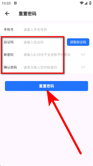 3、输入验证码,设置新密码,点击重置密码,完成密码重置。