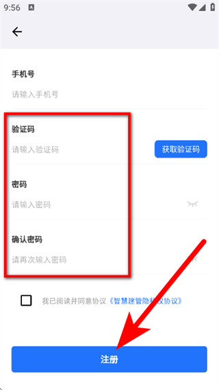 4、输入验证码,设置密码,勾选相关协议后,点击注册,完成注册。