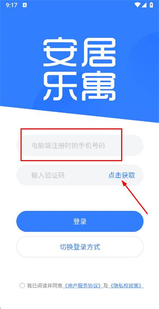 2、在手机登录页面填写手机号,勾选协议后,点击获取验证码。