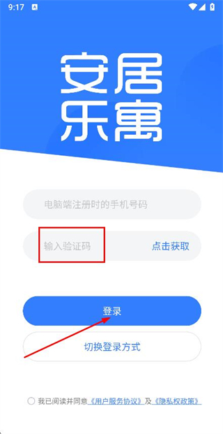 3、在验证码输入框中填写收到的验证码,点击登录完成账号的登录操作。