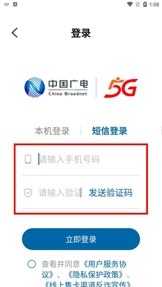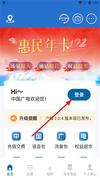 1、打开中国广电app,在首页找到登录按钮并点击,进入登录页面。