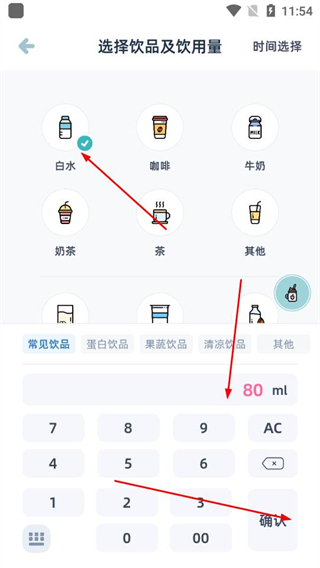 2、进入选择饮品页面后,挑选目标饮品,并输入饮用容量,点击确认。
