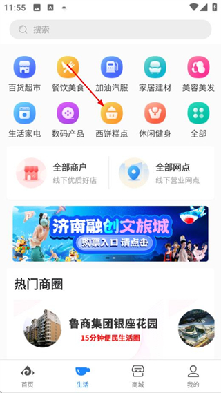 1、在山东一卡通首页点击西饼糕点选项,进入对应门店列表页面。
