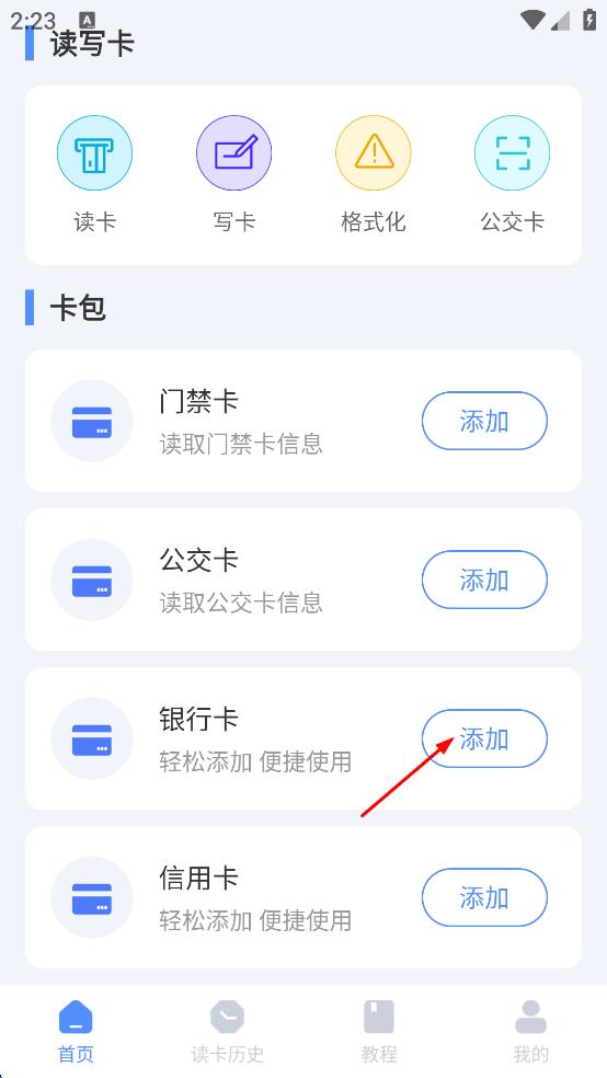 1、打开读卡类软件,进入首页后,在卡包区域找到银行卡选项,点击其右侧“添加”按钮。