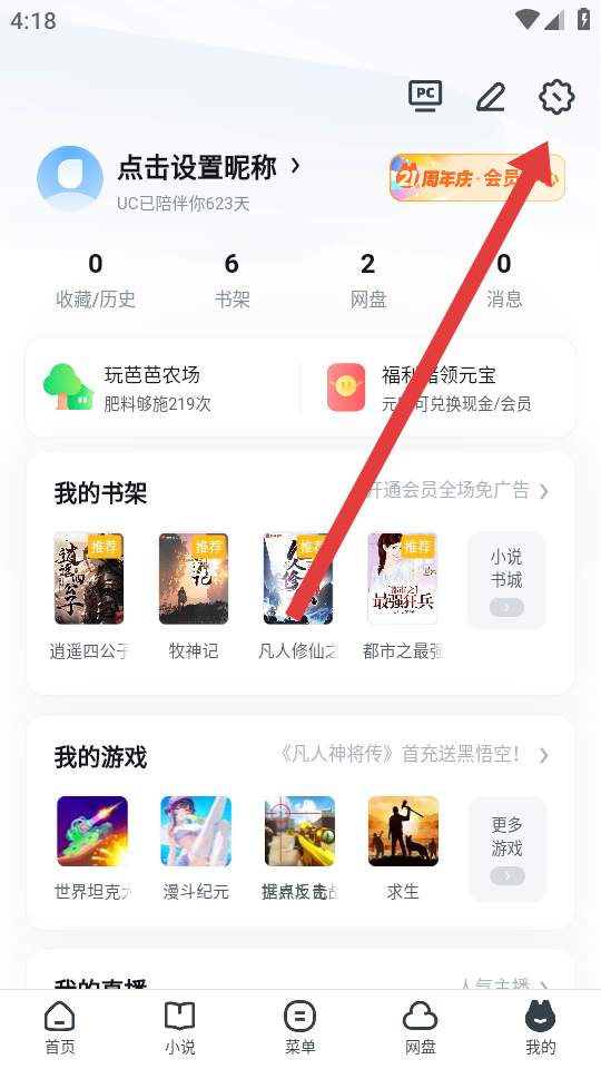 1、进入UC浏览器我的页面,点击右上角设置图标,进入设置的界面。