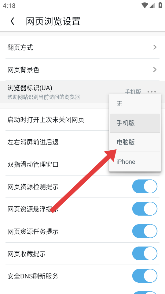 3、在网页浏览设置页面内,点击浏览器标识的下拉菜单并选择电脑版,就可以切换为电脑版浏览模式。