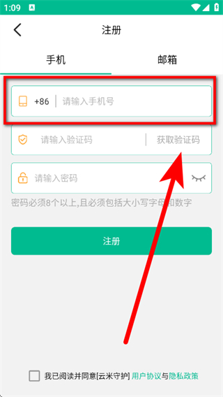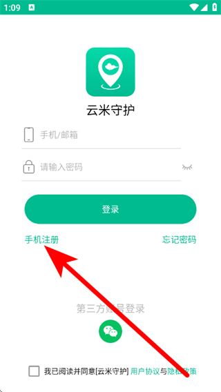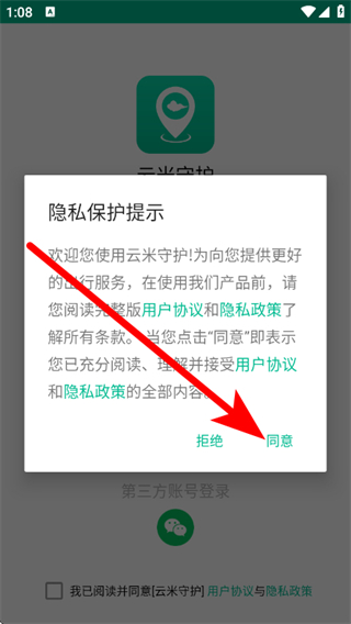 1、打开云米守护,在弹窗点击同意,进入登录页面。