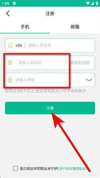 4、输入验证码和设置密码,勾选相关协议后,点击注册,完成注册。