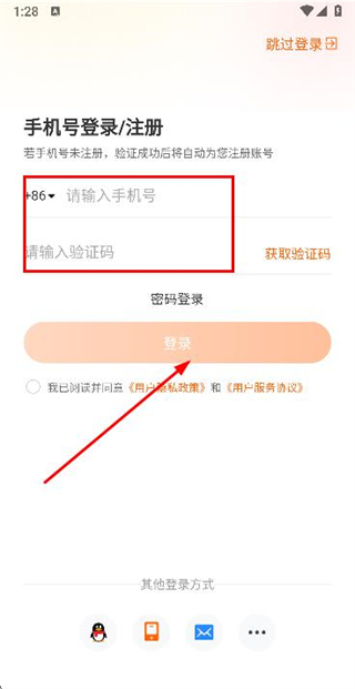 3、在登录页面填写手机号和验证码,勾选协议后,点击登录完成账号登录操作。