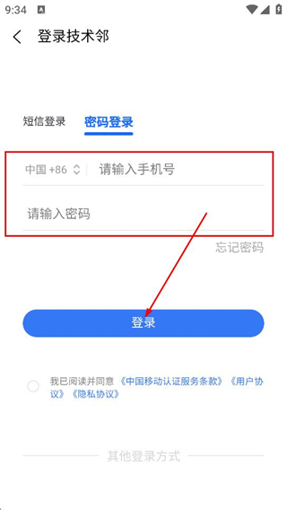 3、在密码登录界面,填写手机号和密码,点击登录,完成技术邻账号的登录操作。