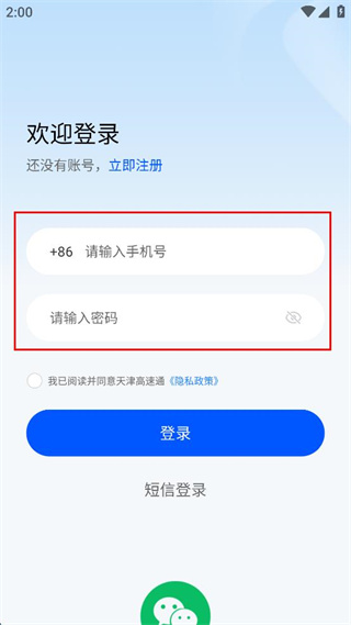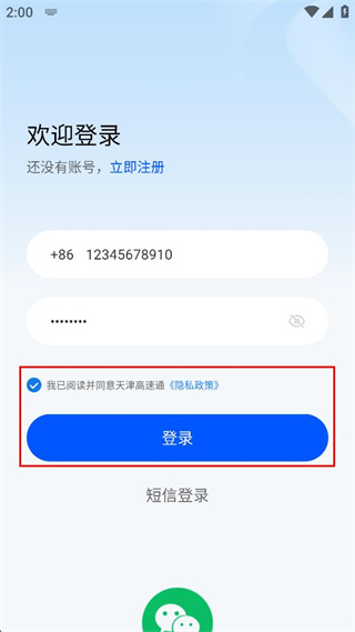 4、勾选同意隐私政策的选项,点击登录按钮完成天津高速通的登录流程。