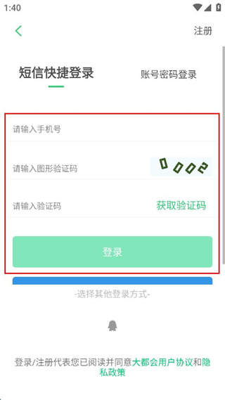 4、在登录界面填写手机号,依次完成图形验证码和短信验证码的填写操作。