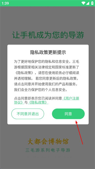 1、打开三毛游出现隐私政策更新提示,阅读内容后点击同意按钮进入软件。