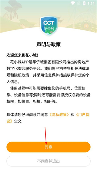 1、打开花小城出现声明与政策弹窗,阅读相关内容后点击同意按钮进入软件。