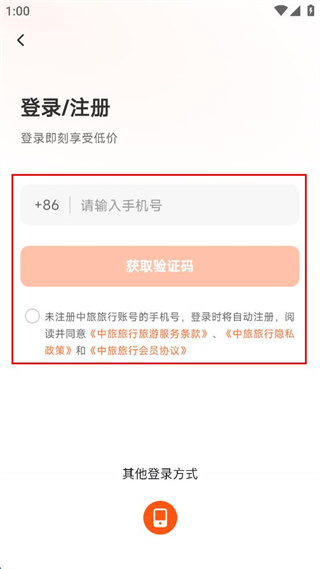 4、在登录注册界面填写手机号码,准备点击获取验证码继续后续操作。