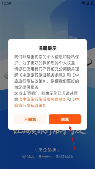 1、打开中旅旅行出现温馨提示弹窗,阅读相关条款后点击同意按钮进入软件。