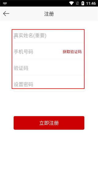 3、在注册页面依次填写真实姓名手机号码,获取并填入验证码,设置密码。