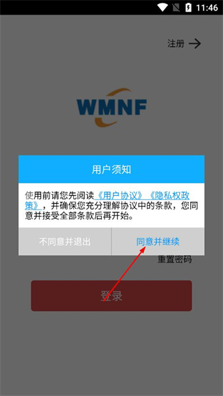 1、打开WMNF软件出现用户须知弹窗,阅读相关协议后点击同意并继续按钮。