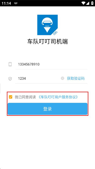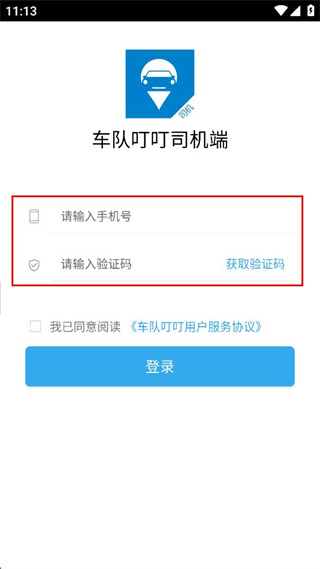 1、打开车队叮叮司机端,进入登录页面,点击手机号输入框填写对应的手机号码。