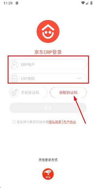 2、在登录页面填写ERP账号密码,勾选协议后,点击获取验证码。