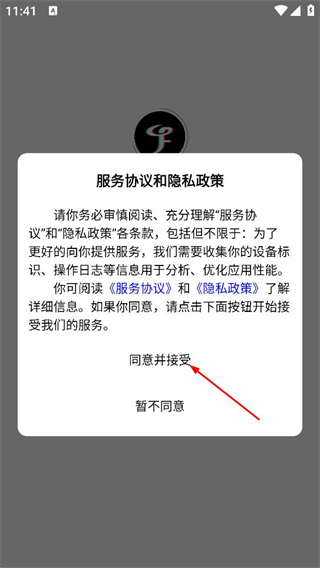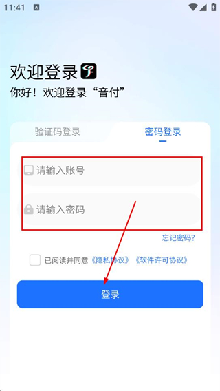 1、在服务协议和隐私政策弹窗中,点击同意,进入音付的登录页面。