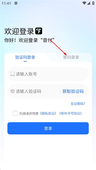 2、在音付登录页面,点击密码登录选项,切换至密码登录的操作界面。