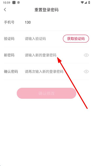 4、在重置登录密码页面,输入手机号、验证码,设置新密码并确认密码后,点击确认修改即可完成登录密码重置。