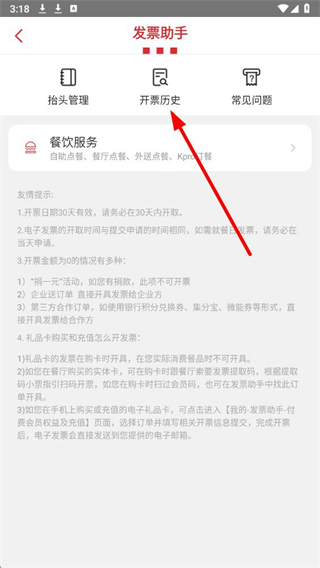3、在发票助手页面,点击顶部的开票历史标签,进入开票历史界面。