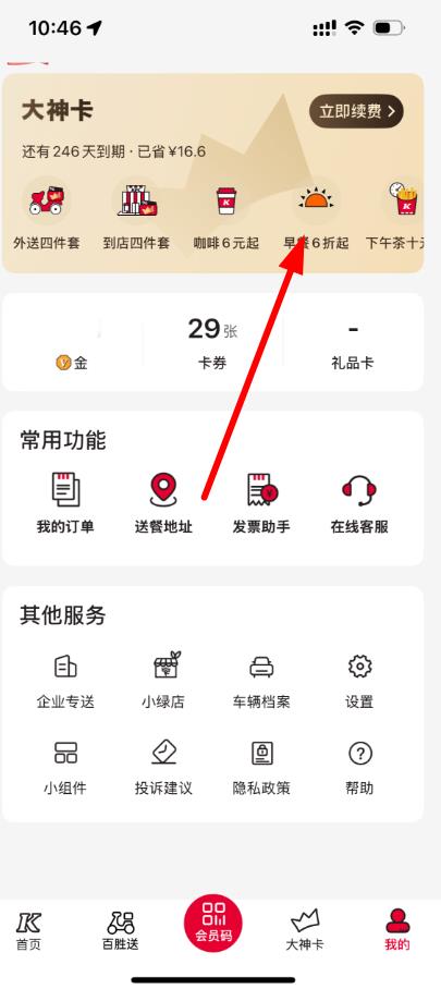 1、打开肯德基app,点击底部导航栏我的,在大神卡板块下方找到“早餐6折起”图标,点击进入早餐页面。