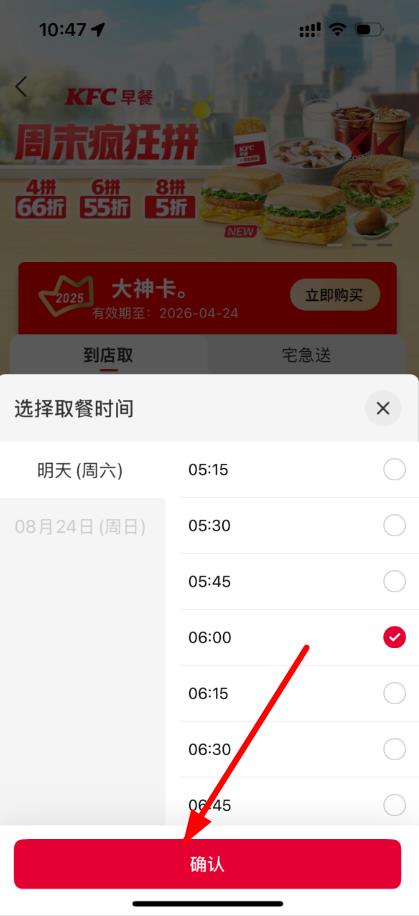 3、在弹出的选择取餐时间界面,选择想要取餐或送达的时间,点击确认,接着挑选早餐商品并完成下单支付即可。