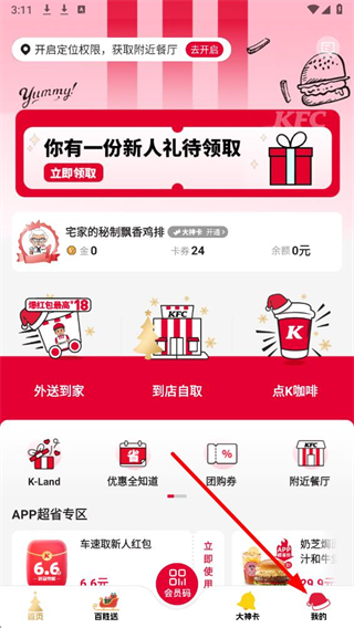 1、打开肯德基APP后,在底部导航栏找到我的选项并点击。