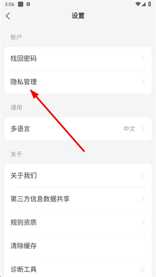 2、在设置界面,点击隐私管理选项,进入隐私管理页面。