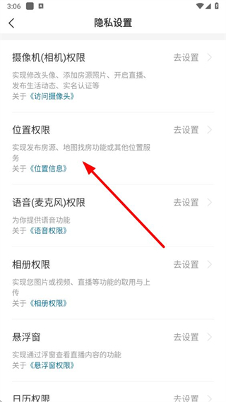 4、在隐私设置页面,找到位置权限选项,点击去设置即可进行位置权限设置。
