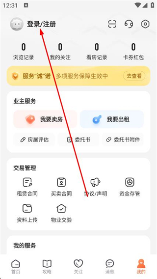 2、在我的页面中,找到并点击上方的登录/注册选项。