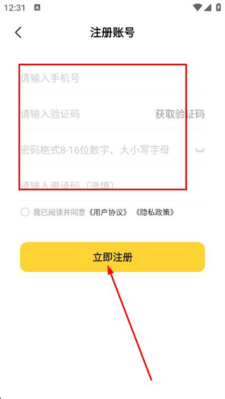 4、在页面依次输入手机号、验证码,设置密码,勾选同意用户协议,点击立即注册完成账号注册。