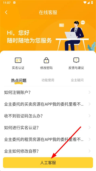 3、在在线客服页面点击人工客服按钮,弹出服务类型选择框。