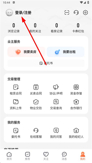 2、在个人中心页面,点击登录注册选项,进入登录注册界面。