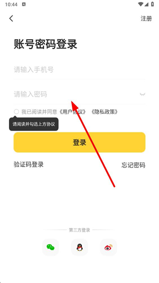 4、在账号密码登录页面,输入手机号和密码,勾选相关协议后点击登录按钮,即可完成密码登录操作。