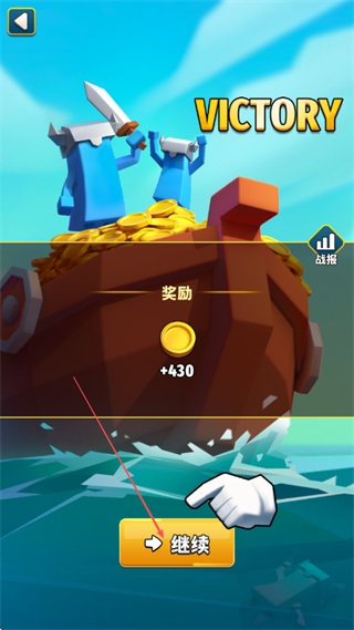 4、获得VICTORY胜利提示,点击继续领取+430奖励,推进游戏。