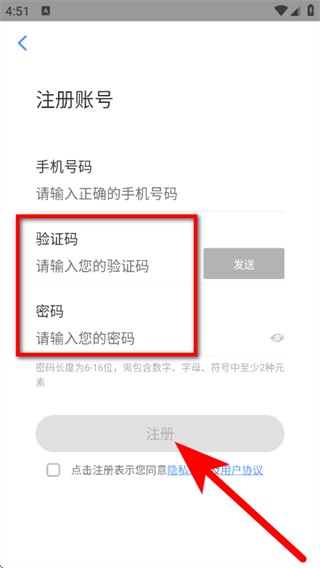 4、输入验证码和设置密码,勾选后,点击注册,完成账号注册。