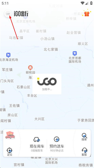 2、等待iGO出行APP加载完成,进入应用的主界面,可看到地图及相关功能选项。