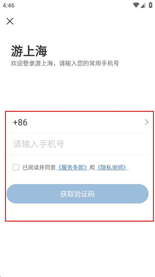 4、在登录页面选择地区代码,填写手机号并勾选相关协议,再点击获取验证码按钮。