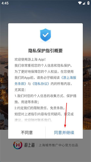 1、打开游上海软件,看到隐私保护指引概要弹窗,阅读内容后点击同意并继续按钮。