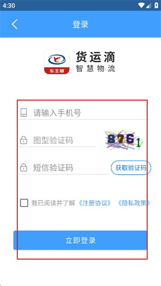 4、在登录页面依次填写手机号、图形验证码、短信验证码,勾选相关协议后点击立即登录。