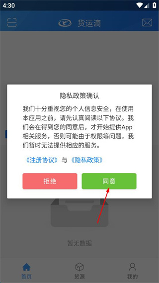 1、打开货运滴软件,看到隐私政策确认弹窗,阅读相关内容后,点击弹窗中的同意按钮。