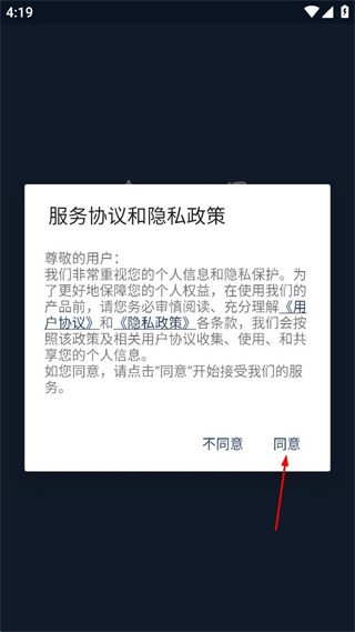 1、打开骑行世界软件,看到服务协议和隐私政策弹窗,阅读相关内容后,点击弹窗右下角的同意按钮。