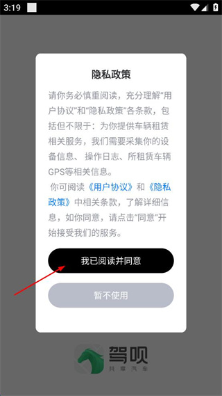 1、打开驾呗应用,在弹出的隐私政策窗口中,点击我已阅读并同意按钮,进入主页面。