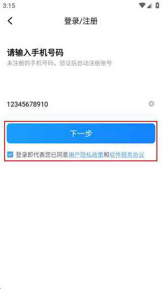 4、勾选登录即代表同意相关协议的选项,点击蓝色的下一步按钮继续流程。