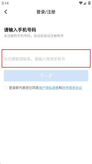 3、在登录注册页面的输入框中,填写常用的手机号码,准备进行后续操作。