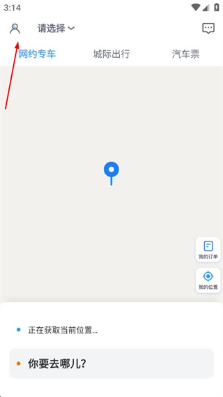 1、打开网约车应用,点击页面左上角的请选择旁的头像图标,进入个人中心页面。